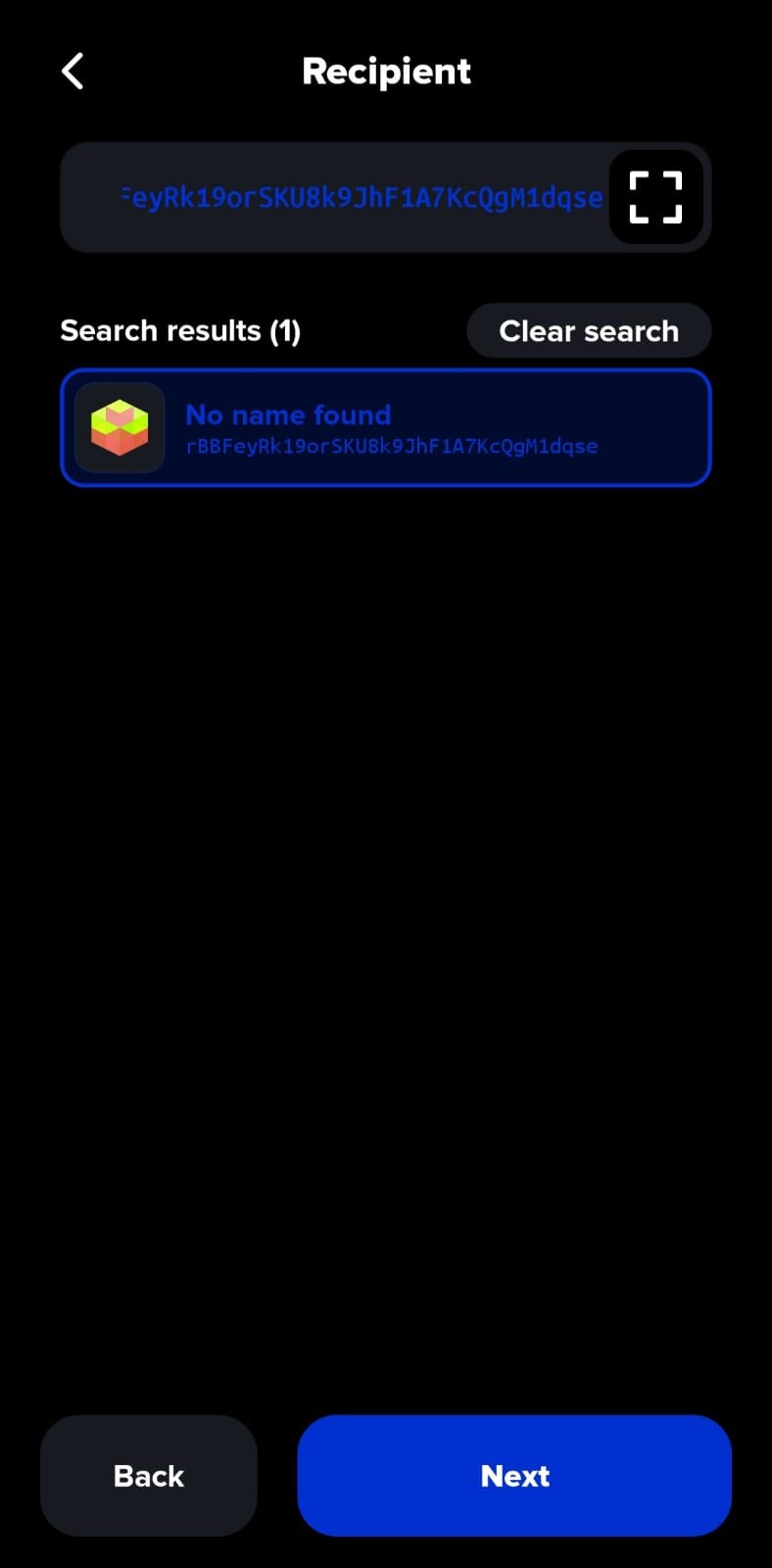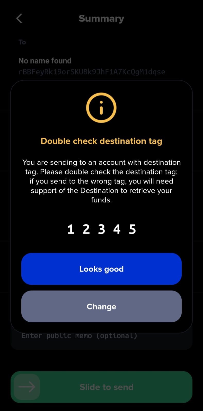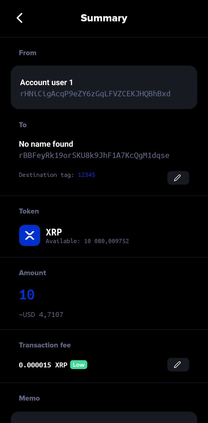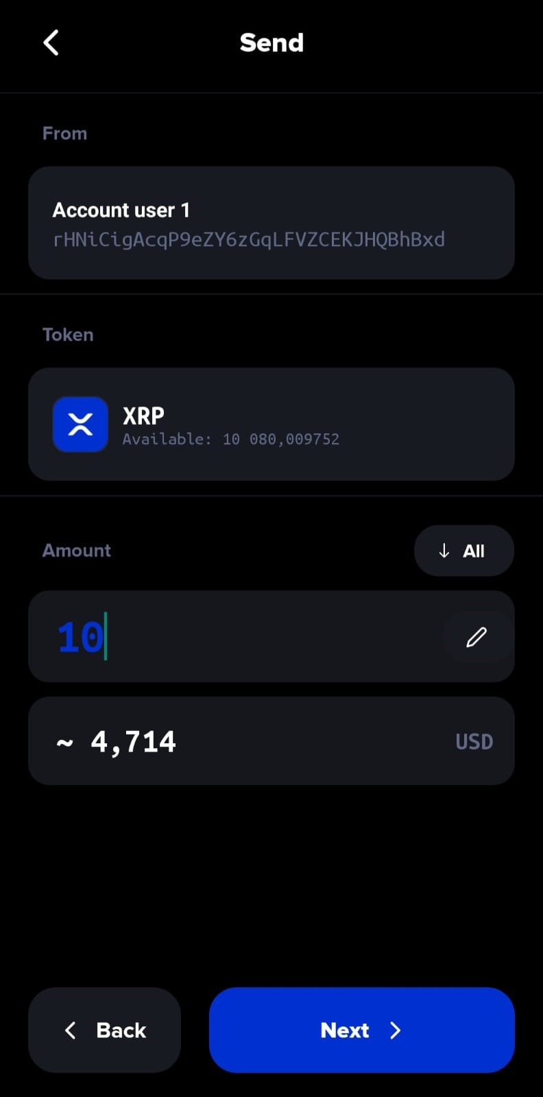 - Select the "SEND" option and enter the public key of the destination account. In this example, XRP is transferred to the Mandla Money custody address with the Mandla ID "12345"
