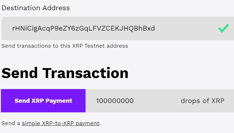 - Enter the public address of the user account. Enter the number of XRP "drops" to be transferred