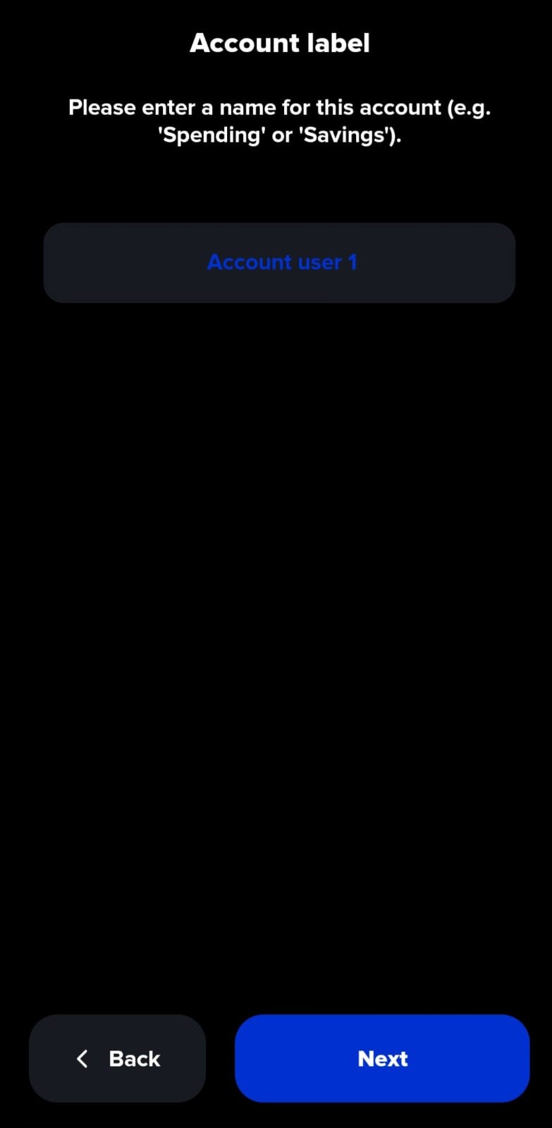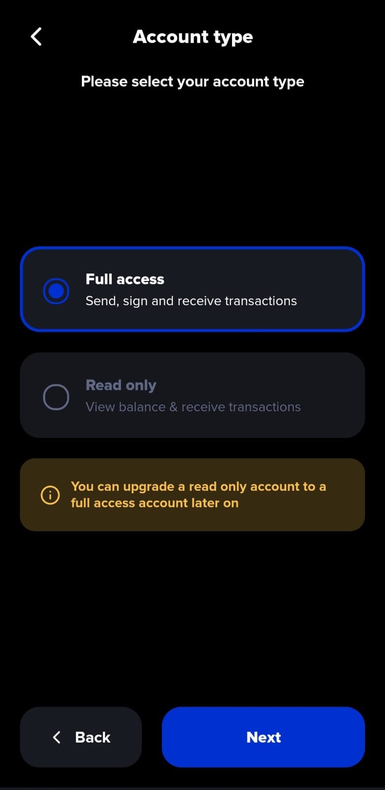 - Select "Import an existing account" and select "Full access" to allow for transactions to take place.