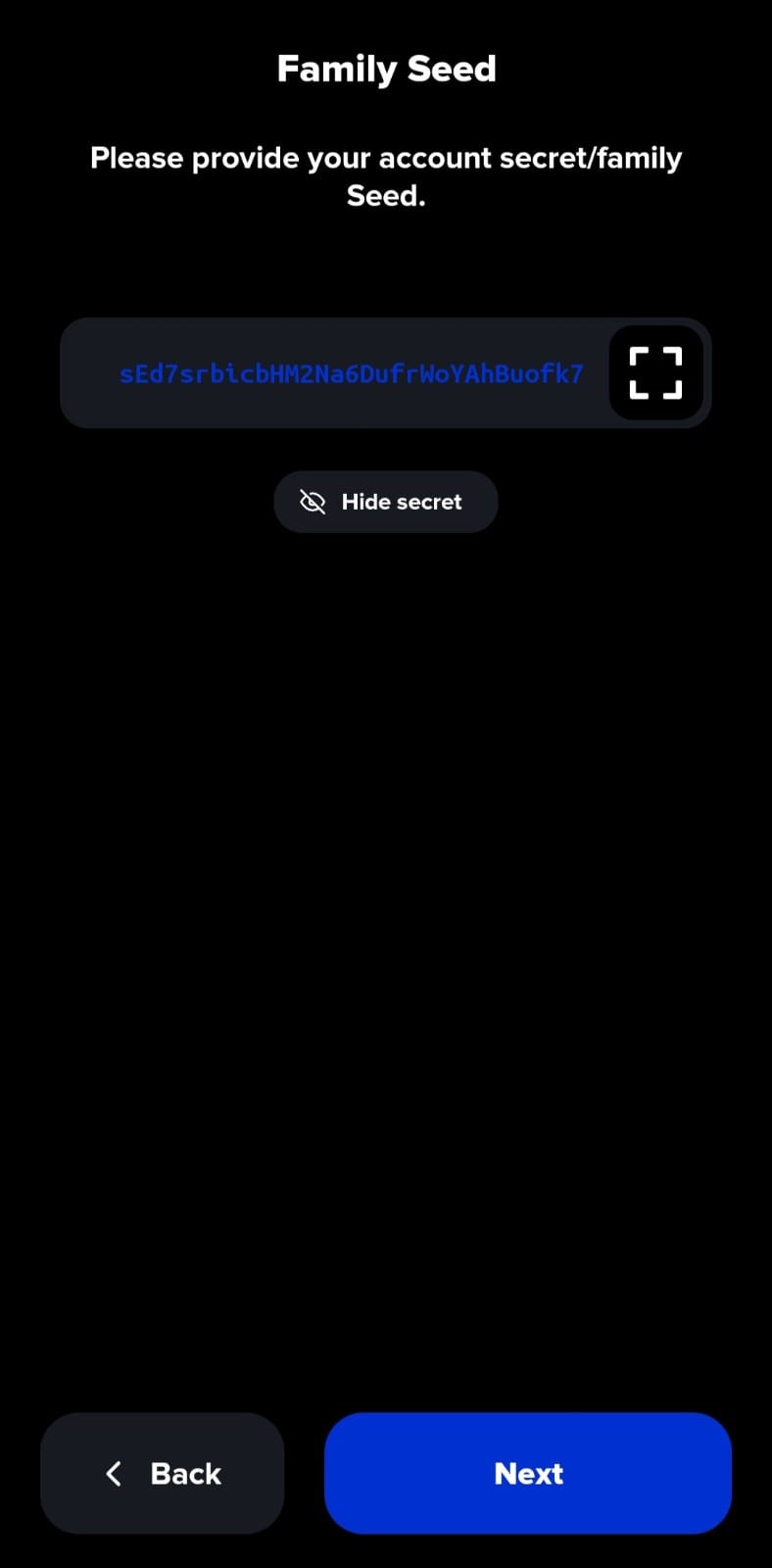- Enter the secret "Family Seed" which is the private key/memo given to the user at the time of registration.