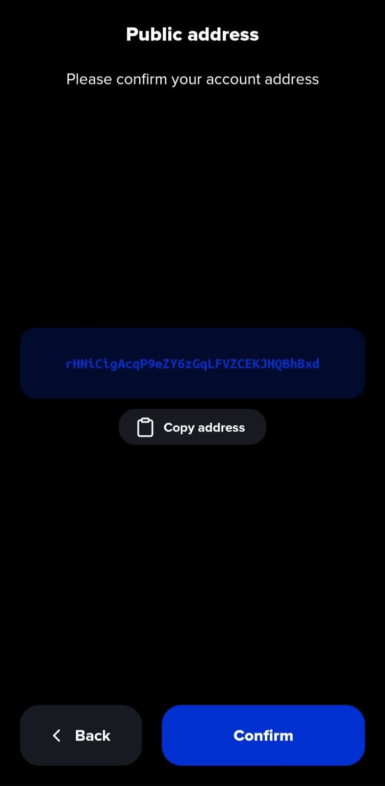 - The user would now be able to view their Mandla Wallet's public account address. Verify this address and select "Confirm". The address of this user account is "rHNiCigAcqP9eZY6zGqLFVZCEKJHQBhBxd".